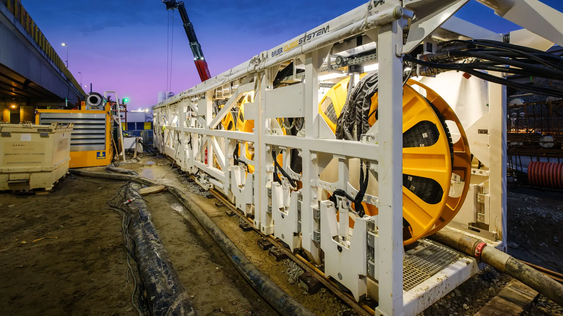 Das Cube System wurde gemeinsam von der BAUER Maschinen GmbH und Denys speziell für die Erstellung von Schlitzwänden aus einem bestehenden Tunnel heraus entwickelt. Dieses Konzept ermöglicht damit auch die Ausführung von Bauvorhaben in beengten und sensiblen Umgebungen an der Oberfläche. Es handelt sich um ein modulares, containerbasiertes System zur Herstellung von Schlitzwänden. Sämtliche Systemkomponenten sind so ausgelegt, dass sie in Standard-High-Cube-Containern transportiert werden können. Aufwendige Schwertransporte entfallen, was die Baustellenlogistik vereinfacht. Das System kann wahlweise mit einem HD-1400-Diesel- oder einem HE-1400-Elektro-Aggregat betrieben werden – gerade bei innerstädtischen Projekten mit strengen Emissionsvorgaben ein Vorteil.